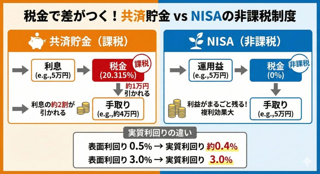 共済貯金は利息が出ても税金が差し引かれる一方、NISAは利益をそのまま受け取れます。