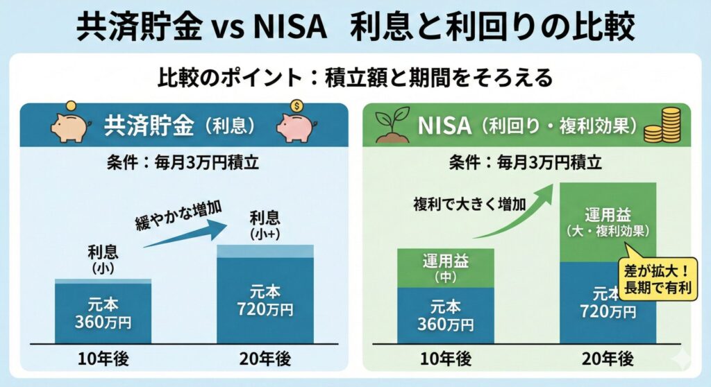 共済貯金は安全性を重視した貯蓄、NISAは将来の成長を狙う運用と役割が明確に異なります。