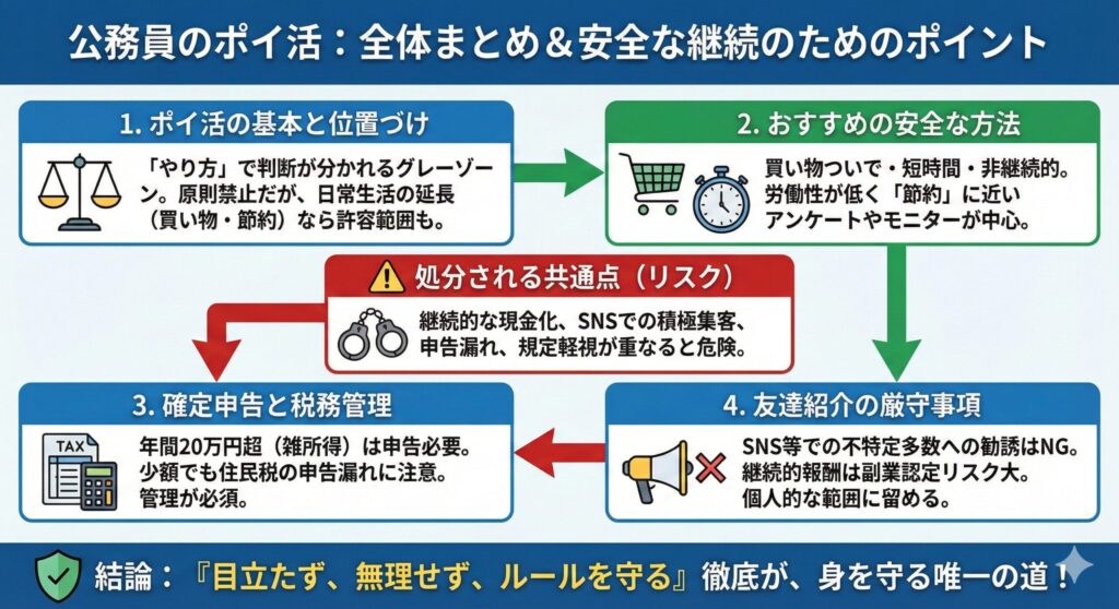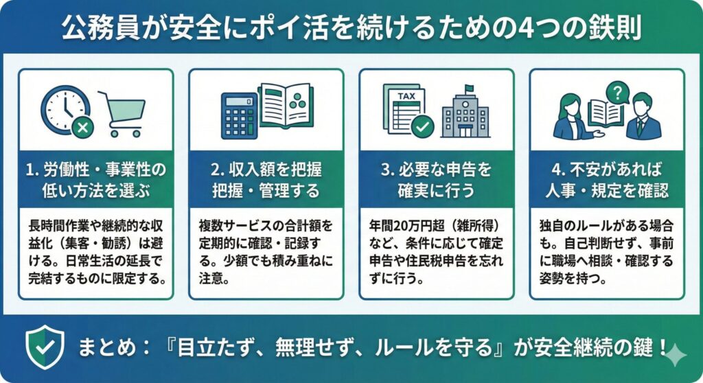 公務員がポイ活を安全に続けるためには、「やっていいか」ではなく「どうやるか」が重要です。