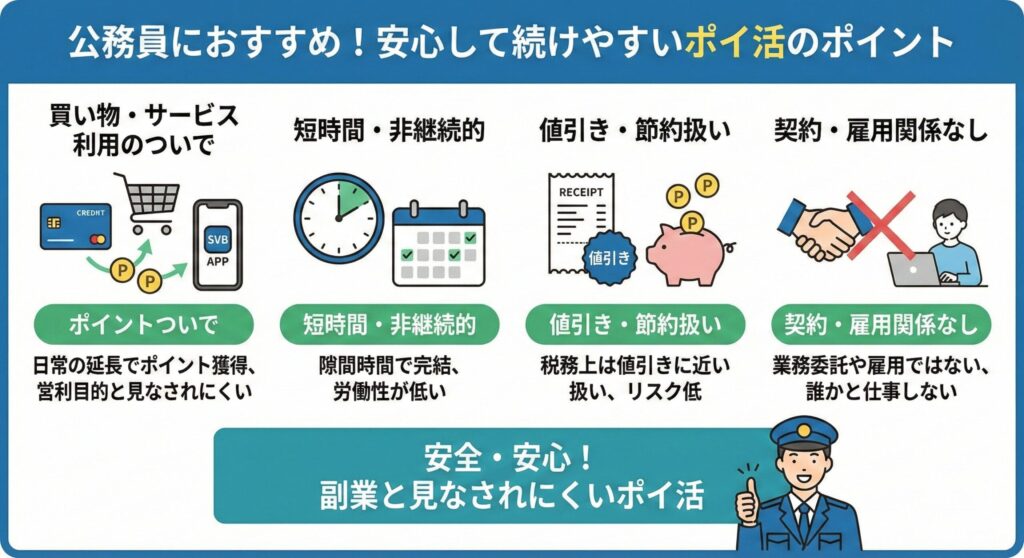 公務員がポイ活をする場合は、「副業と見なされにくいかどうか」を軸に選ぶことが大切です。