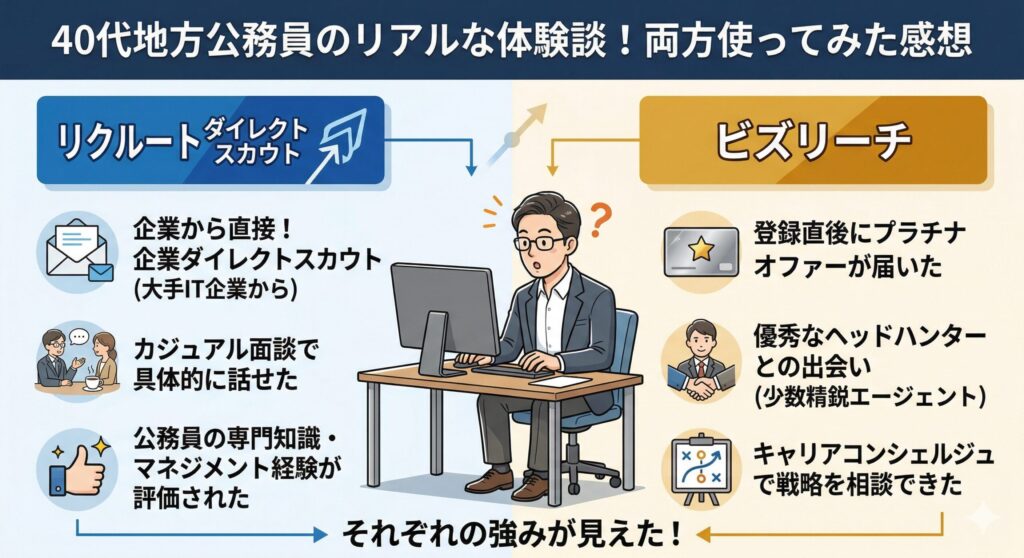 ここからは、40代の現役地方公務員である僕が、リクルートダイレクトスカウトとビズリーチの両方に登録して転職活動を行った実体験をもとに、両サービスの違いをお伝えします。