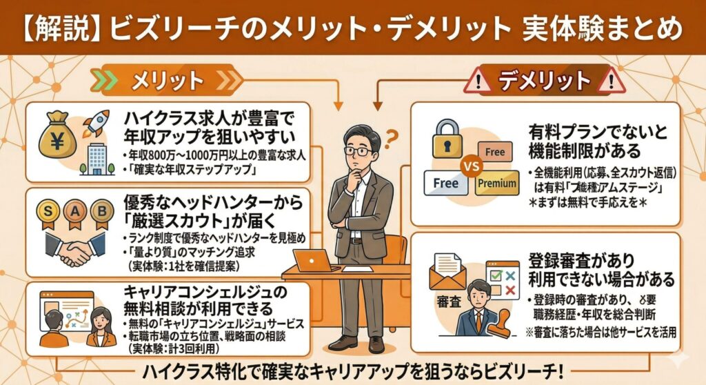 続いて、ビズリーチのメリット・デメリットを整理します。審査制ならではの特徴や、有料プランの存在が使い勝手にどう影響するのかを、実体験をもとにお伝えします。
