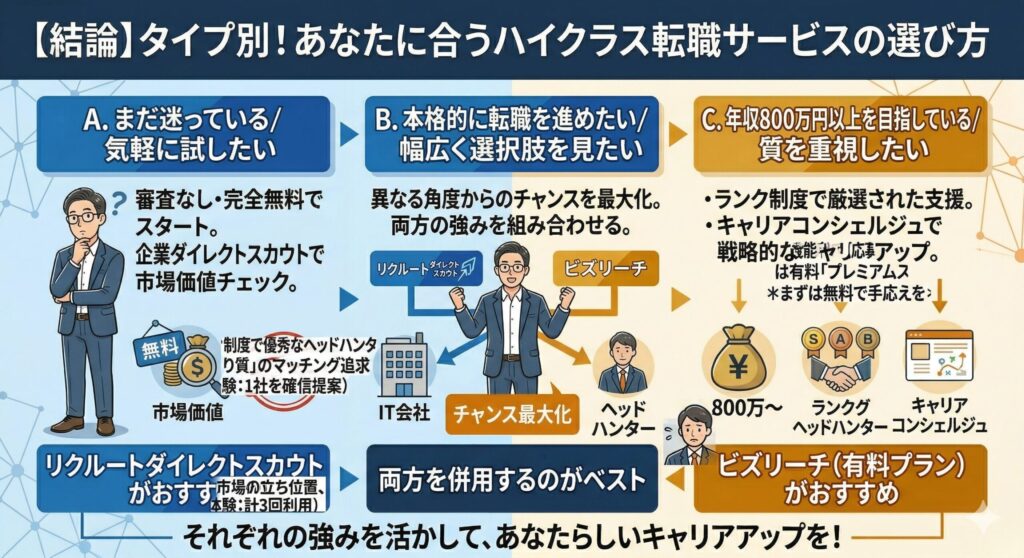 まとめると、じっくり戦略を立てたい方にはビズリーチのキャリアコンシェルジュ、実践的に動きながら進めたい方にはリクルートダイレクトスカウト+リクルートエージェントの連携が合っていると感じました。